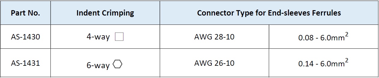 - Crimp for End-sleeves ferrules with AWG 28-10 / 0.08-6.0 sq.mm.